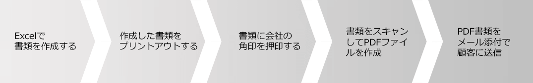 これらの一連の作業を見積書、注文書、請求書、納品書のすべての書類で行っていたので、書類の処理には膨大な時間がかかっていました。書類1枚あたり5分としても、注文1件あたりの書類作成にかかる時間は約20分になります。